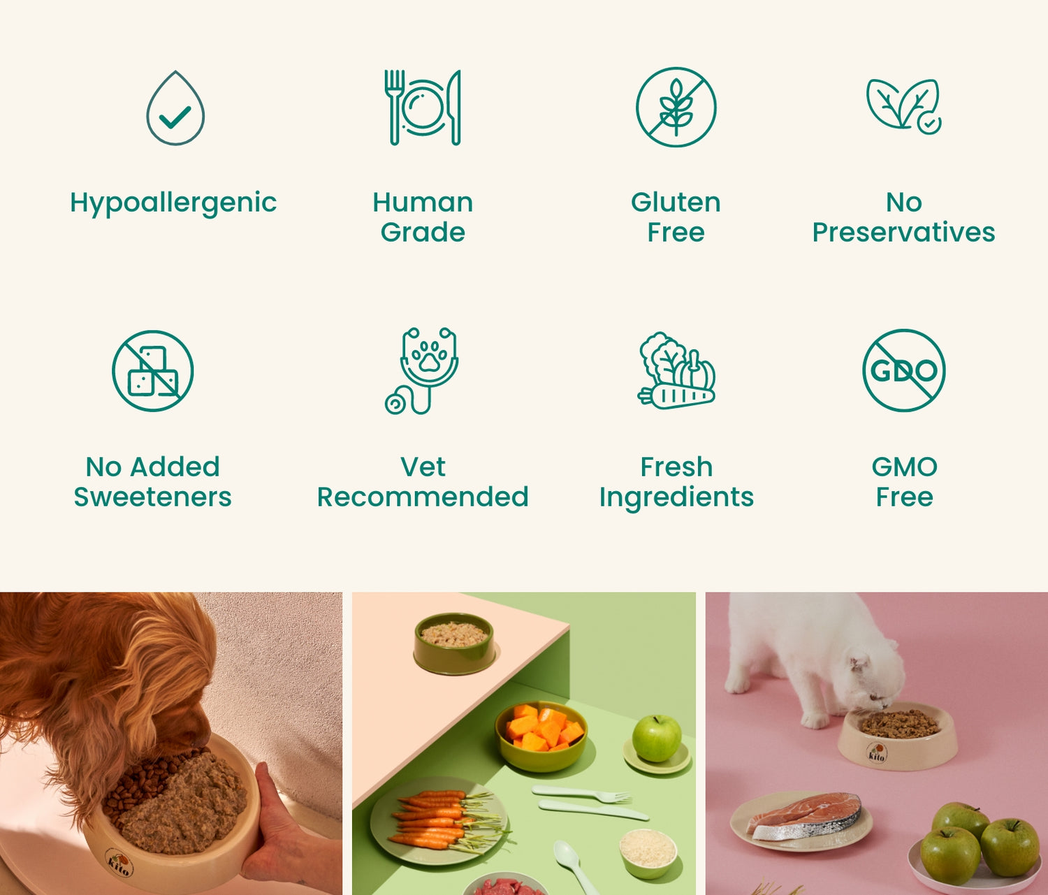Kito Fresh meets all nutritional needs of cats and dogs and contains no additives. For example, Kito Fresh with Beef includes: beef, beef heart, beef liver, rice, potato, pumpkin, carrot, egg, pea, red lentil, apple, vegetable oil, eggshell, flaxseed, and dried rosemary. With 40% meat content, it’s completely additive-free.