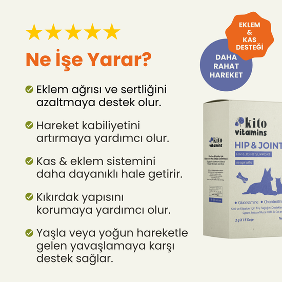 Glukozamin HCL (Glucosamine Hcl,13.2.8.) 60 mg, Kondroitin Sülfat (Chondroitin Sulphate, 13.12.2.) 30 mg, Metil Sülfonil Metan (Methyl Sulphonyl Methan, 13.9.1.) 25 mg, Hiyalüronik Asit (Hyaluronic Acid, 13.12.1.) 6 mg, Vitamin C (Askorbik Asit (Ascorbic Acid, 3a300)) 12 mg. Aroma Karaciğer (Meat and Animal Derivatives, 9.1.1.), Maltodekstrin (Maltodextrine, 13.3.6.)
