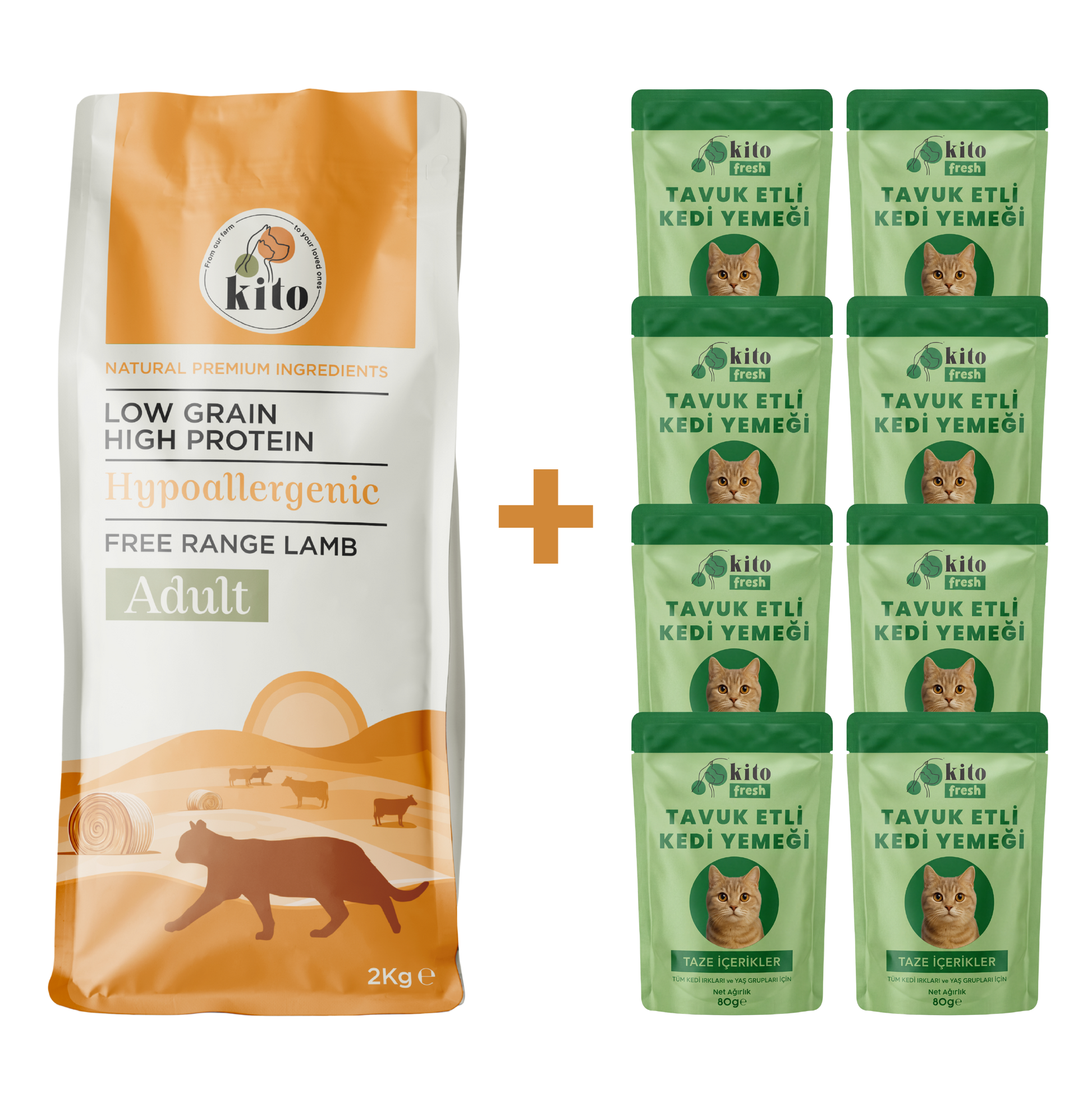 Adult Cat Food 2 KG + Kito Fresh Cat Food with Chicken X 6