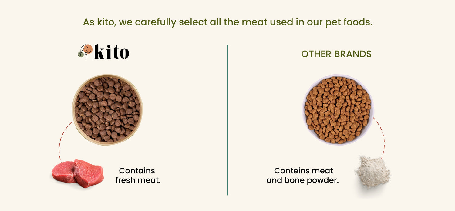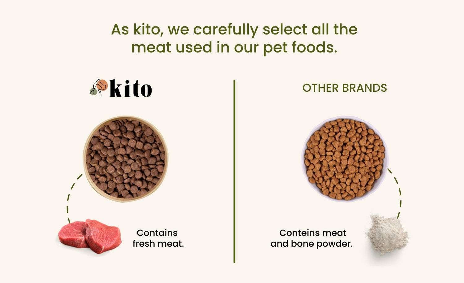 Kito adult dog food, a natural, hypoallergenic, antibiotic-free and GMO-free source of fresh meat, is full of unsaturated fats and beneficial amino acids.