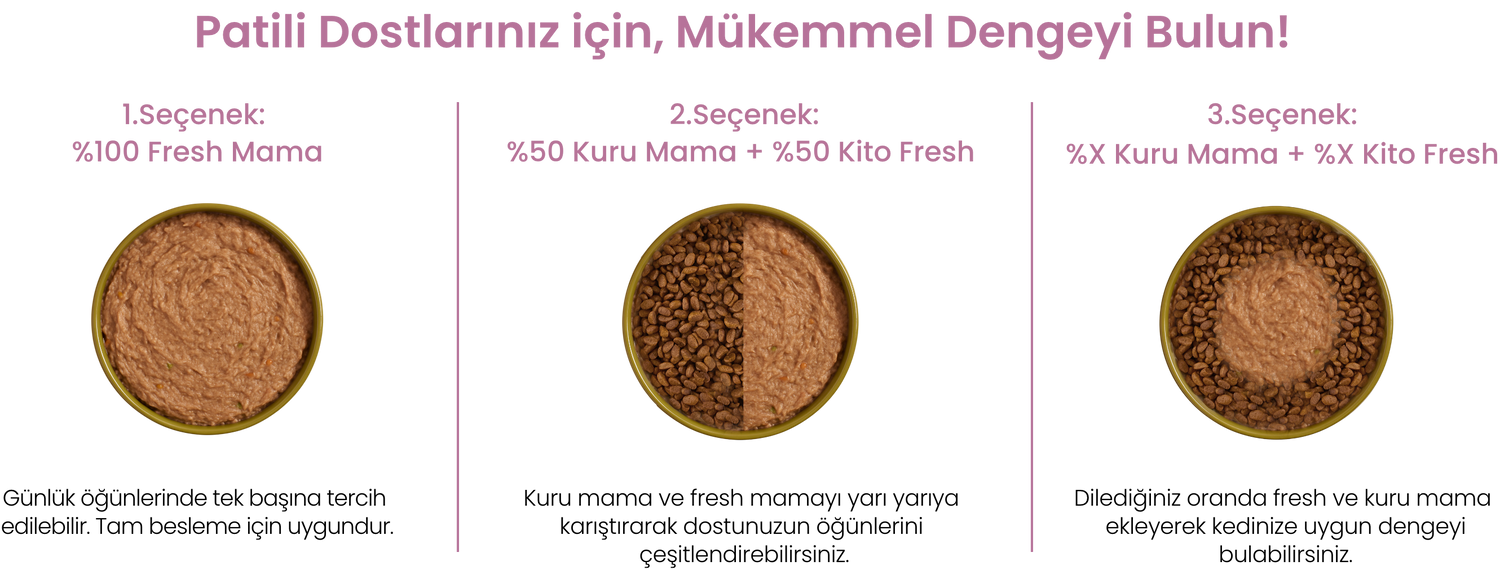 Kito Fresh mamaları hassas cilt yapısına ve sindirim sistemine sahip patili dostlar için, alerji ve hassasiyetleri göz önünde bulundurarak, sağlıklı beslenme programlarına uygun şekilde hazırlıyoruz.