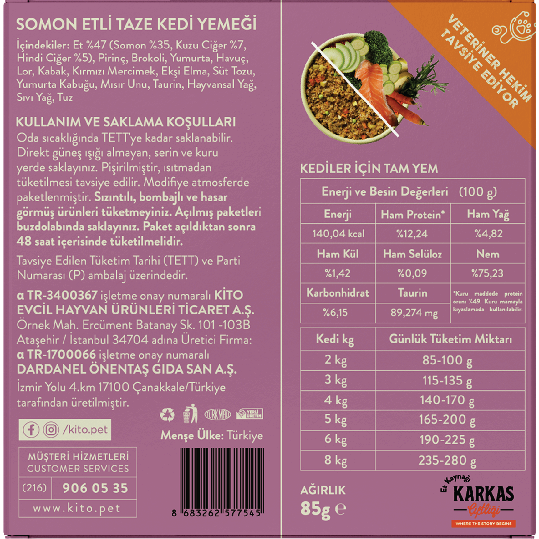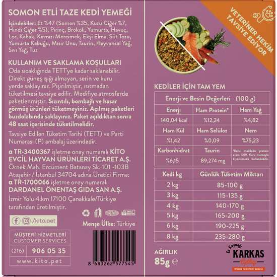 Kito Fresh; yüksek protein, dengeli vitamin mineral içeriği ve doğal lezzetiyle kedinizin ve köpeğinizin ihtiyacına uygun şekilde hazırlanmıştır. Düşük kaliteli yan ürünlere yer vermeden, patili dostlarınızın sağlığını en az sizin kadar önemsiyoruz.