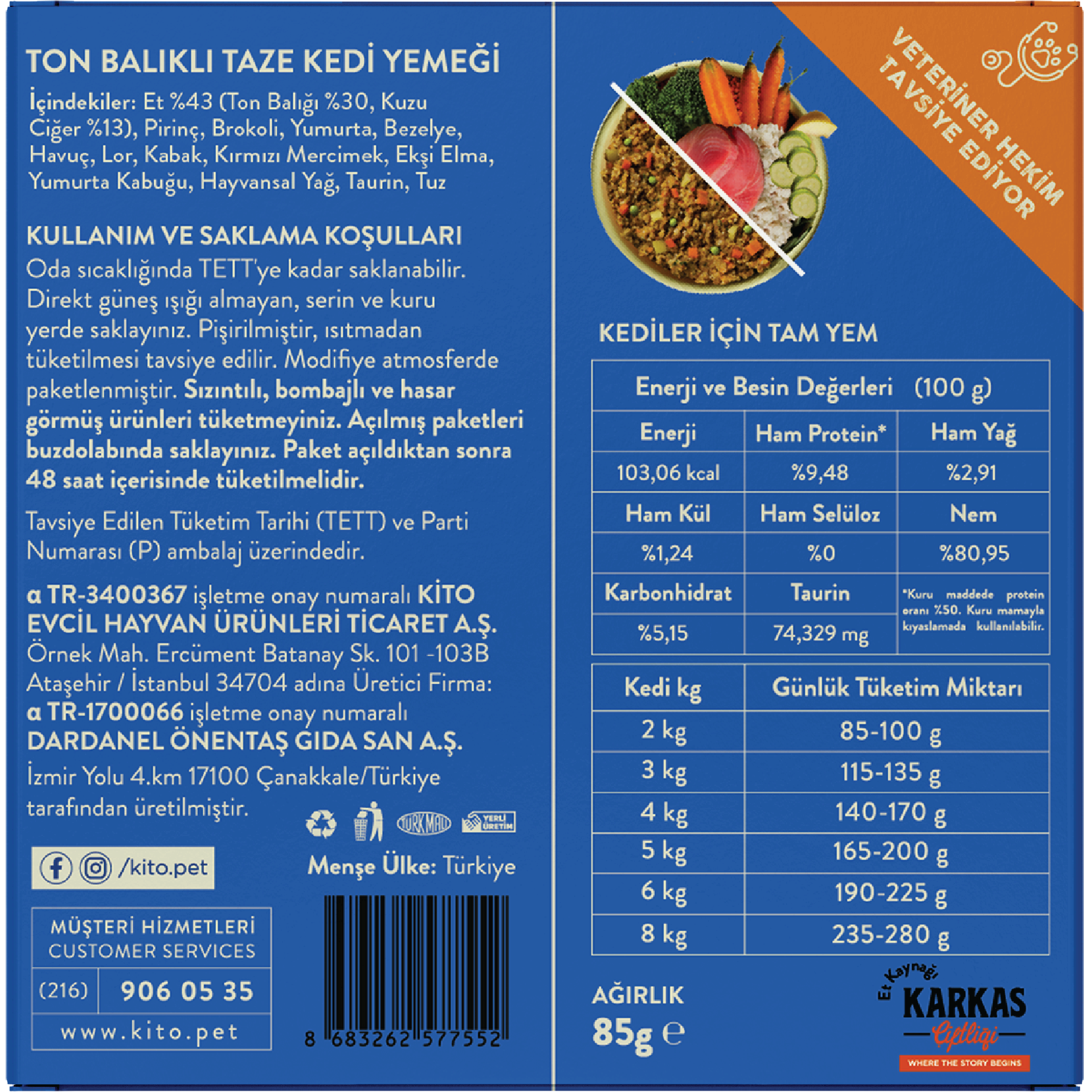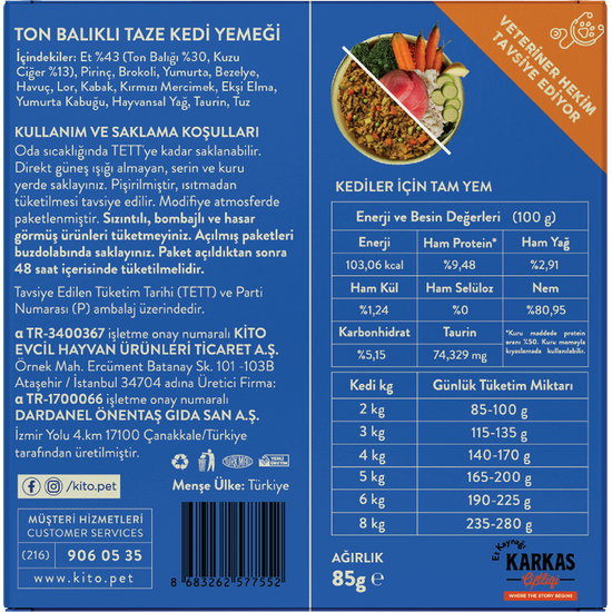 Kito Fresh; yüksek protein, dengeli vitamin mineral içeriği ve doğal lezzetiyle kedinizin ve köpeğinizin ihtiyacına uygun şekilde hazırlanmıştır. Düşük kaliteli yan ürünlere yer vermeden, patili dostlarınızın sağlığını en az sizin kadar önemsiyoruz.