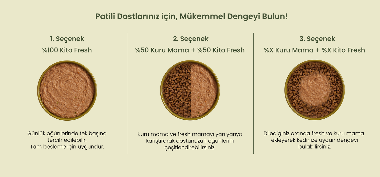 Kito Fresh mamaları hassas cilt yapısına ve sindirim sistemine sahip patili dostlar için, alerji ve hassasiyetleri göz önünde bulundurarak, sağlıklı beslenme programlarına uygun şekilde hazırlıyoruz.
