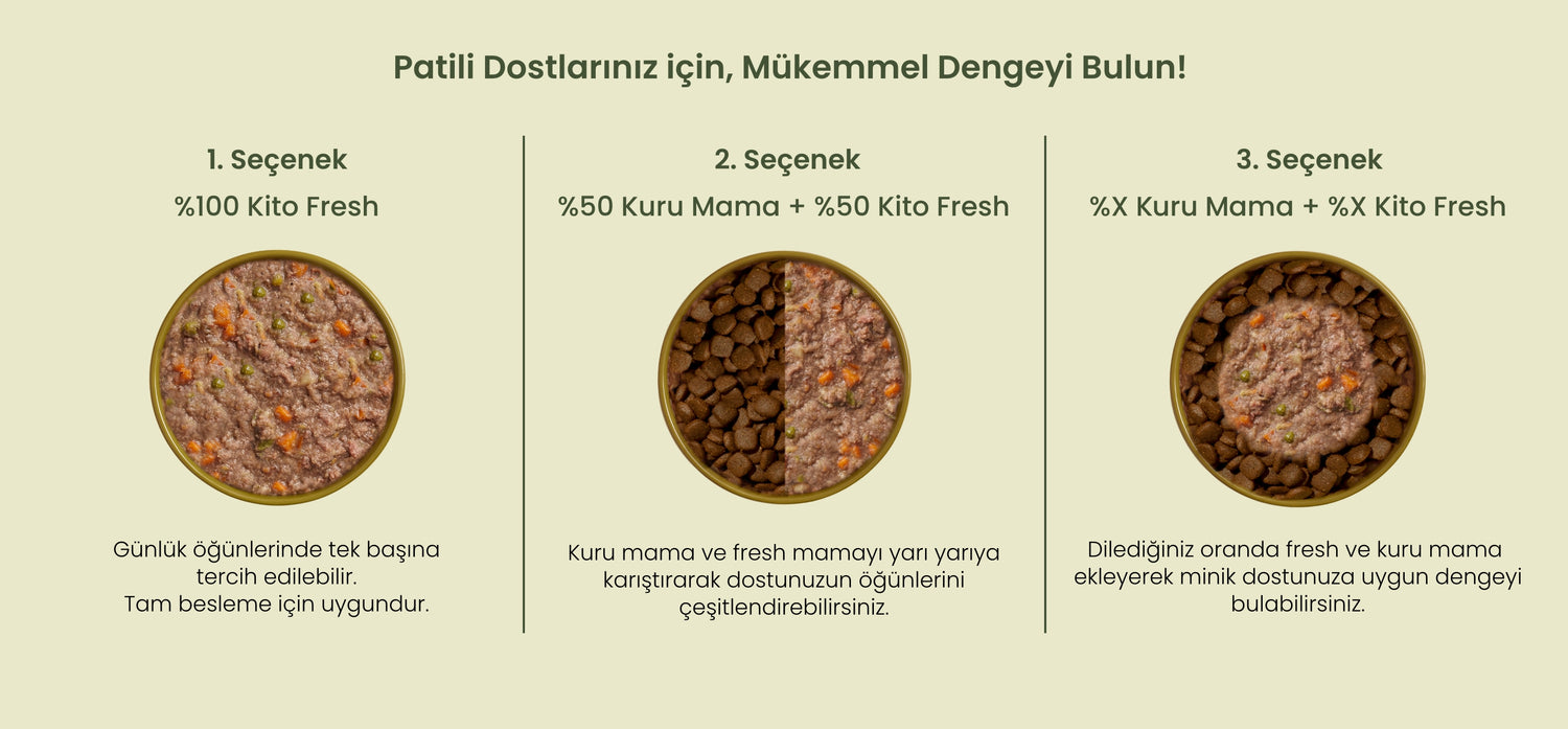 Evcil hayvan diyetine taze besinler eklenmesi, obezite, mide ve deri hastalıklarına yakalanma riskini azaltmakta ve dostlarımızın yaşam sürelerini potansiyel olarak uzatabilmektedir. Taze ve katkısız içeriğiyle bağışıklığı destekleyen Kito Fresh, öğünleri hem daha besleyici hem de lezzetli hale getirir.