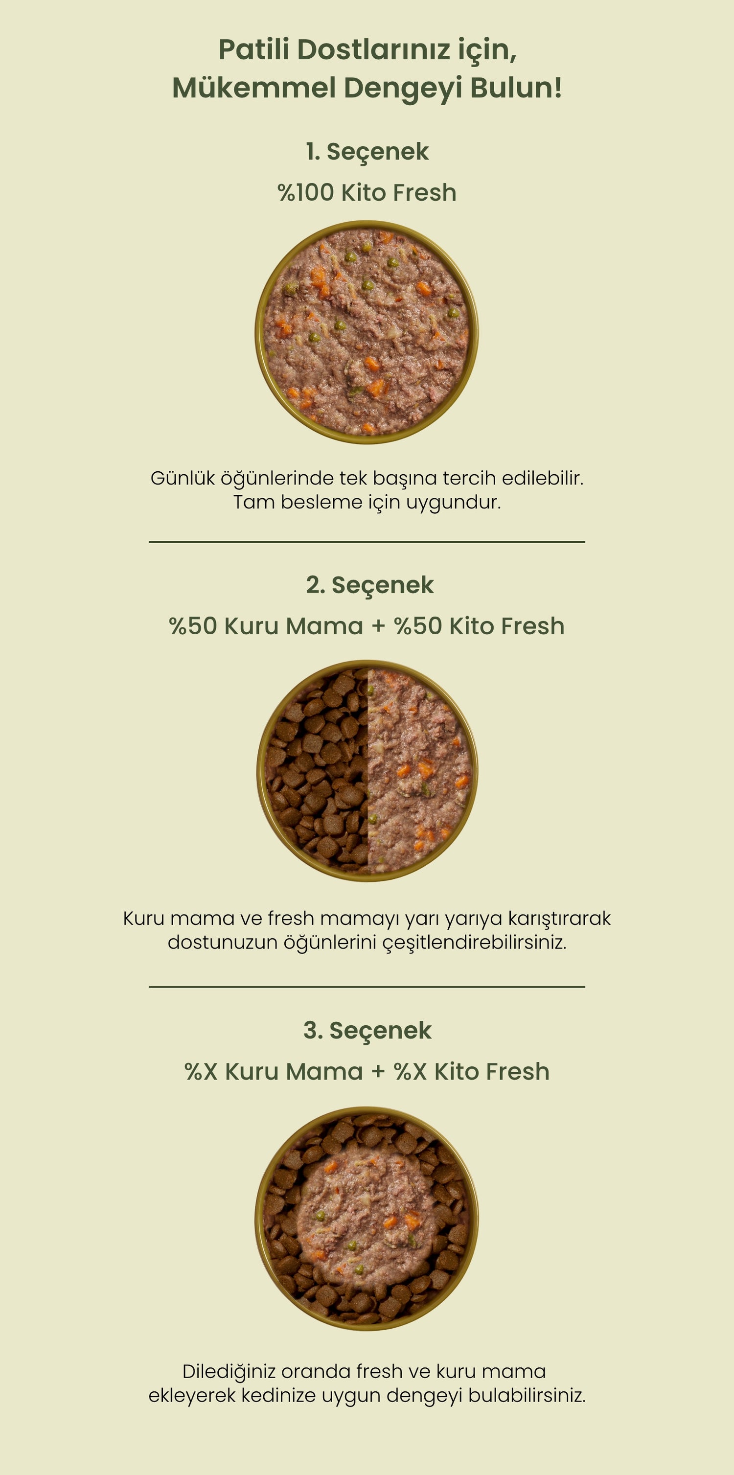 Kito Fresh; yüksek protein, dengeli vitamin -mineral içeriği ve doğal lezzetiyle kedinizin ve köpeğinizin ihtiyacına uygun şekilde hazırlanmıştır. Düşük kaliteli yan ürünlere yer vermeden, patili dostlarınızın sağlığını en az sizin kadar önemsiyoruz.