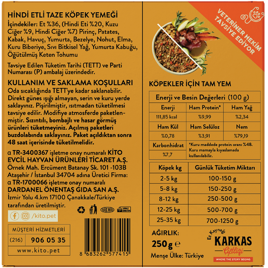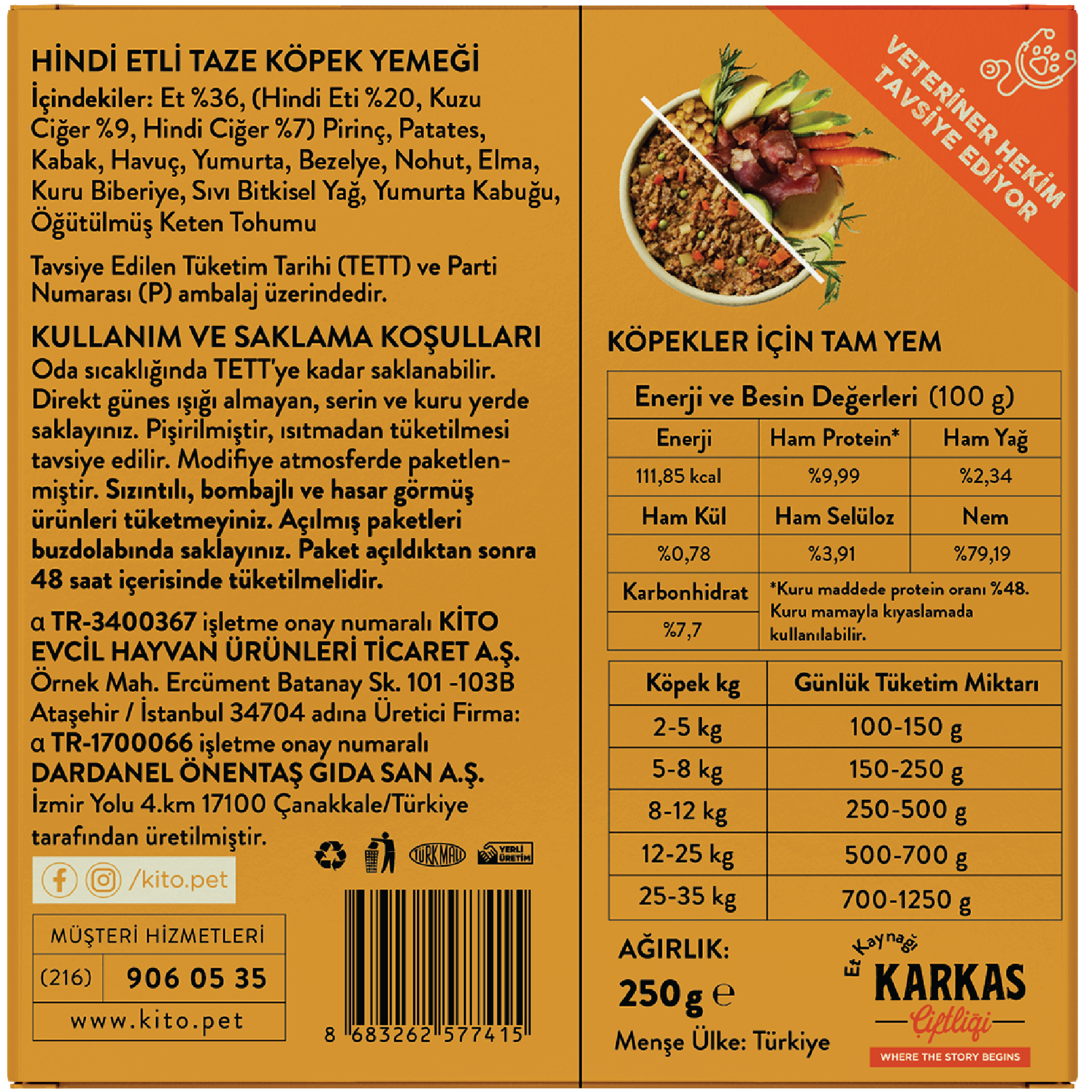 Hindi eti, pirinç, patates, kuzu akciğer, hindi karaciğer, kabak, havuç, yumurta, bezelye, nohut, elma, maydanoz, kuru biberiye, sıvı bitkisel yağ, yumurta kabuğu, öğütülmüş keten tohumu