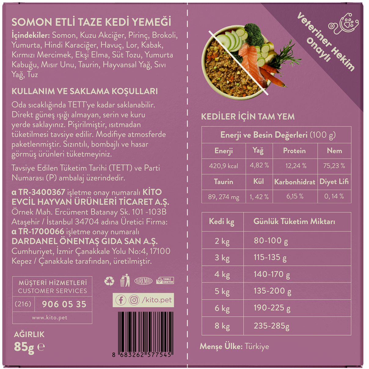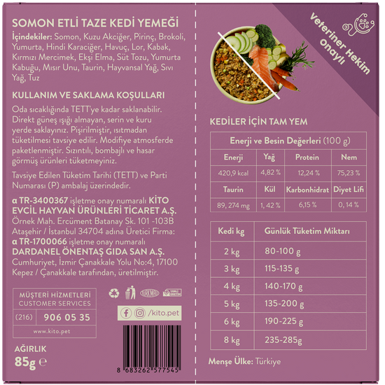 Somon, kuzu akciğer, pirinç, brokoli, yumurta, hindi karaciğer, havuç, lor, kabak, kırmızı mercimek, ekşi elma, süt tozu, yumurta kabuğu, mısır unu, taurin, hayvansal yağ, sıvı yağ, tuz