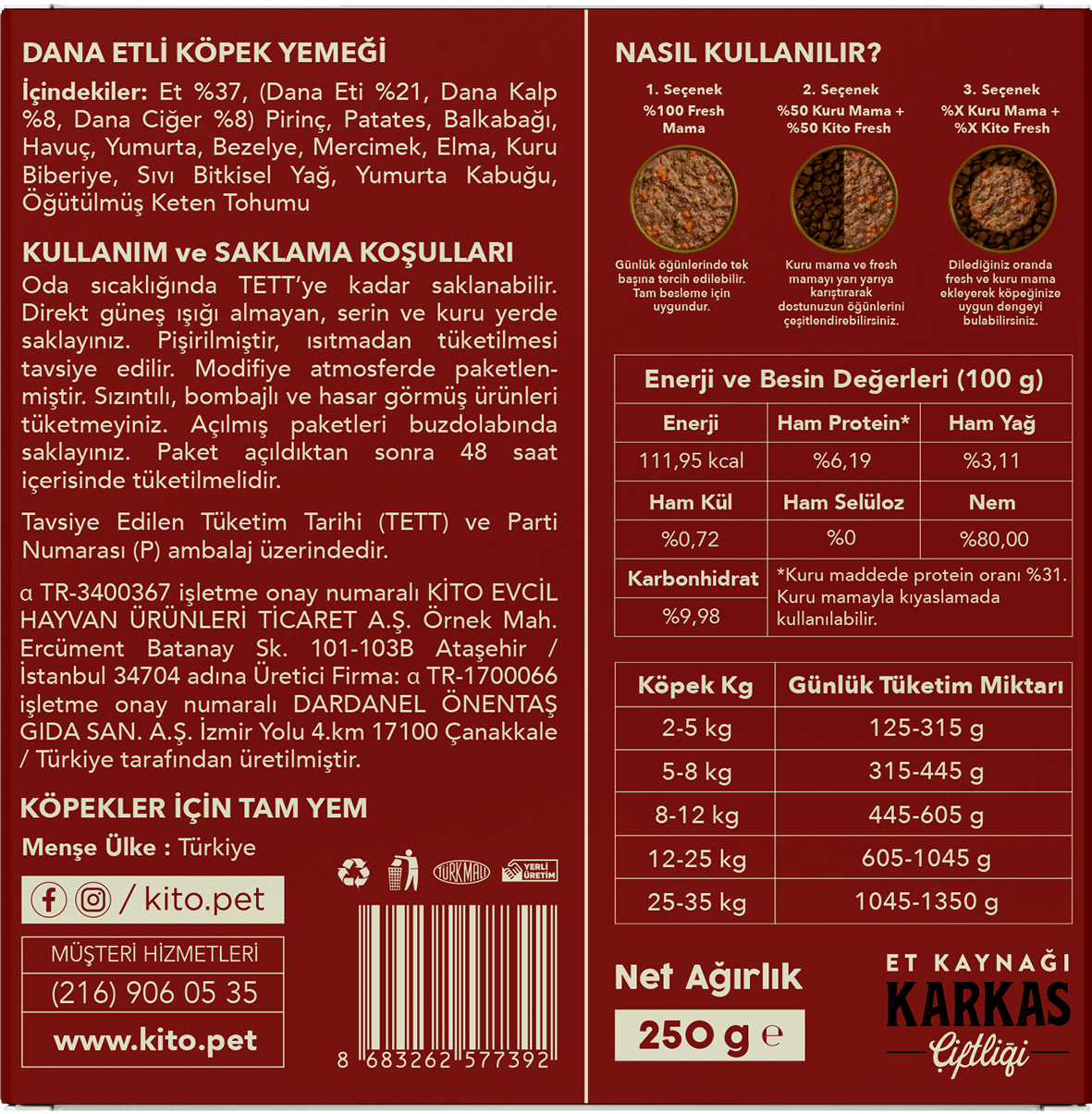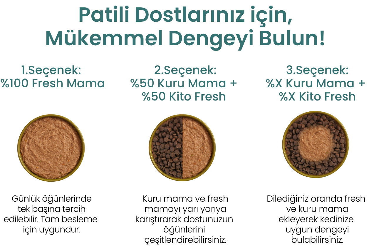 Kito Fresh; yüksek protein, dengeli vitamin mineral içeriği ve doğal lezzetiyle kedinizin ve köpeğinizin ihtiyacına uygun şekilde hazırlanmıştır. Düşük kaliteli yan ürünlere yer vermeden, patili dostlarınızın sağlığını en az sizin kadar önemsiyoruz.