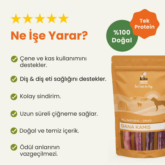 Kurutulmuş Dana Kamış Ödül Maması dostunuzun ihtiyaç duyduğu enerjiyi sağlar. Veteriner hekimler ve beslenme uzmanları tarafından onaylanan dana kamışların her biri dostlarınızın ağız ve diş sağlığını da desteklemeye yardımcı olur. Çiğneme hareketleriyle dişlerin tartarlardan arınmasına yardımcı olur. Siz de evcil hayvanınız için sağlıklı ve lezzetli bir ikram arayışındaysanız Kito Kurutulmuş Dana Kamış Ödül Maması ile eğlence saatlerini tam bir keyif anına dönüştürebilirsiniz!