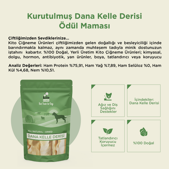 Kurutulmuş Dana Kelle Derisi Ödül Maması dostunuzun ihtiyaç duyduğu enerjiyi sağlar. Veteriner hekimler ve beslenme uzmanları tarafından onaylanan dana ince sinirlerinin her biri dostlarınızın ağız ve diş sağlığını da desteklemeye yardımcı olur. Çiğneme hareketleriyle dişlerin tartarlardan arınmasına yardımcı olur. Siz de evcil hayvanınız için sağlıklı ve lezzetli bir ikram arayışındaysanız Kito Kurutulmuş Dana Kelle Derisi Ödül Maması ile eğlence saatlerini tam bir keyif anına dönüştürebilirsiniz!