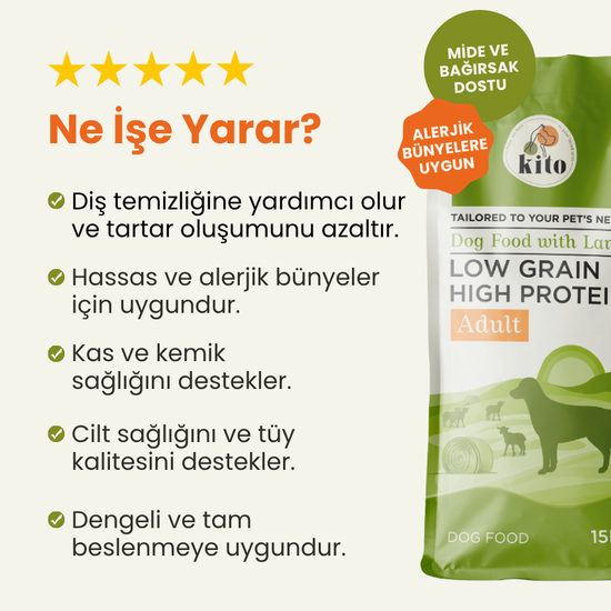 Yüksek kalitede kurutulmuş ve taze kuzu eti, %40 hayvansal protein, %25 pirinç, bezelye, patates, tavuk yağı, şekerpancarı, balık yağı, keten tohumu, bira mayası, hidrolize tavuk ciğeri, kurutulmuş bal kabağı, kurutulmuş havuç, glukozamin, I-Karnitin nükleotit maya proteini, mineraller, deniz yosunu, avize ağacı özütü, zerdeçal kökü tozu, havuç, pisilyum, selenyum, kondroitin.