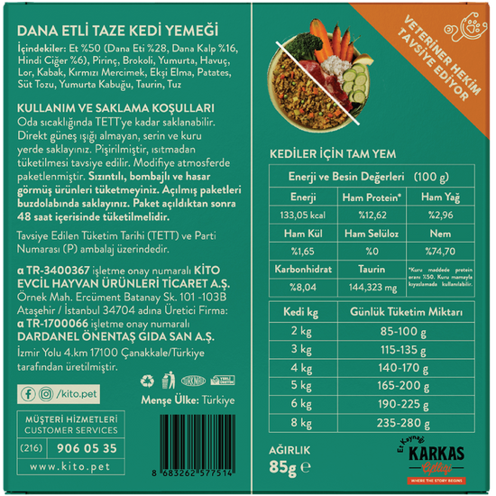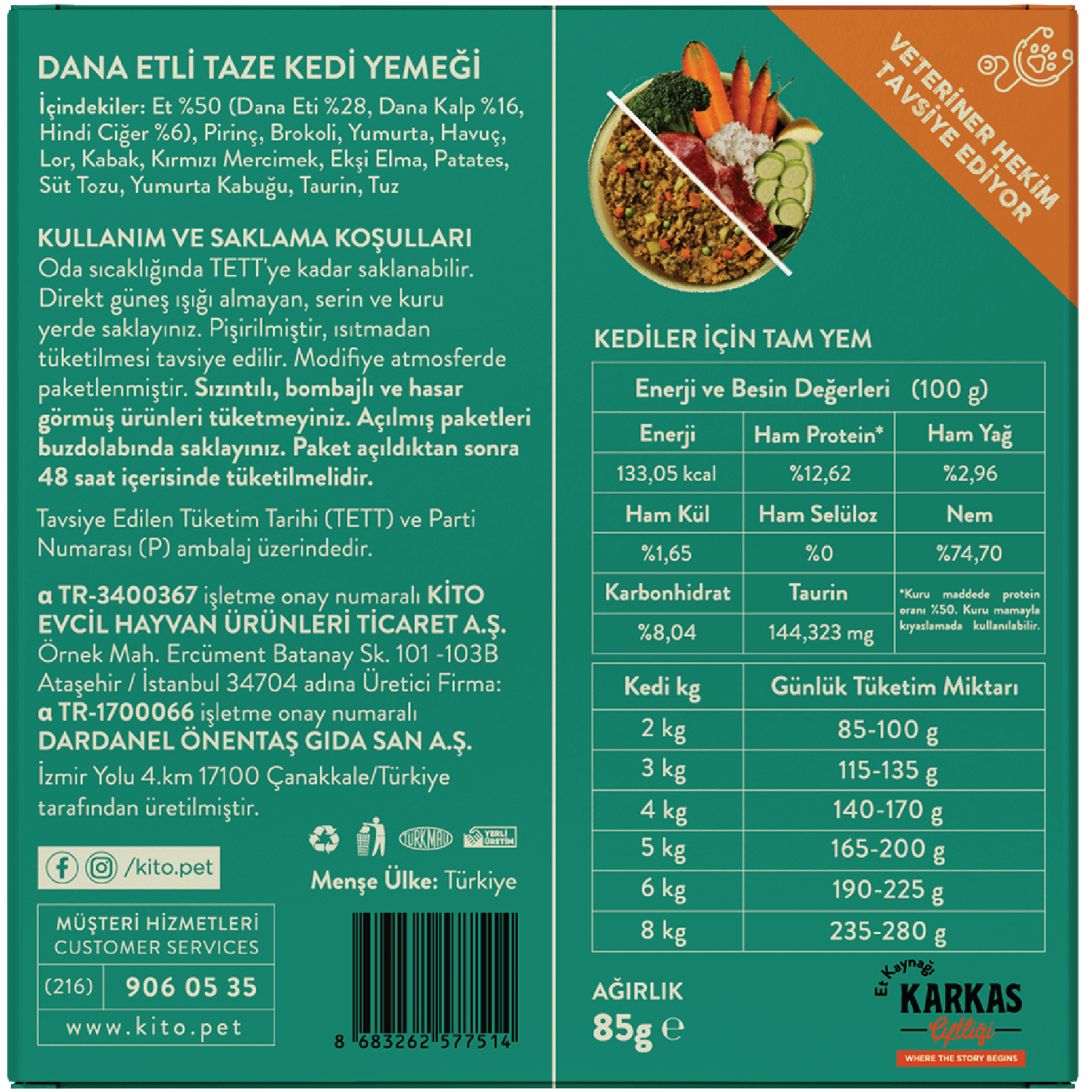 Kito Fresh; yüksek protein, dengeli vitamin mineral içeriği ve doğal lezzetiyle kedinizin ve köpeğinizin ihtiyacına uygun şekilde hazırlanmıştır. Düşük kaliteli yan ürünlere yer vermeden, patili dostlarınızın sağlığını en az sizin kadar önemsiyoruz.