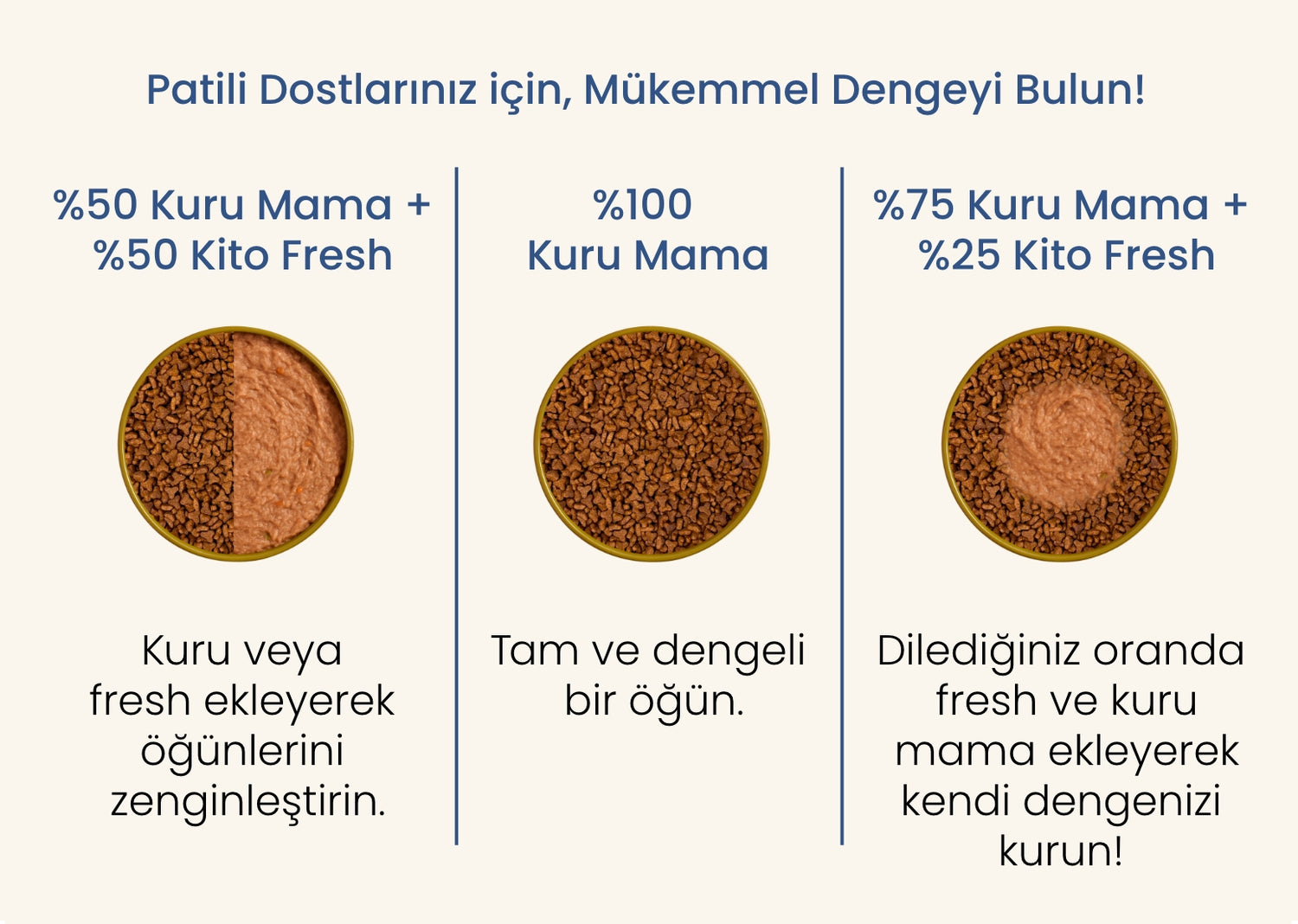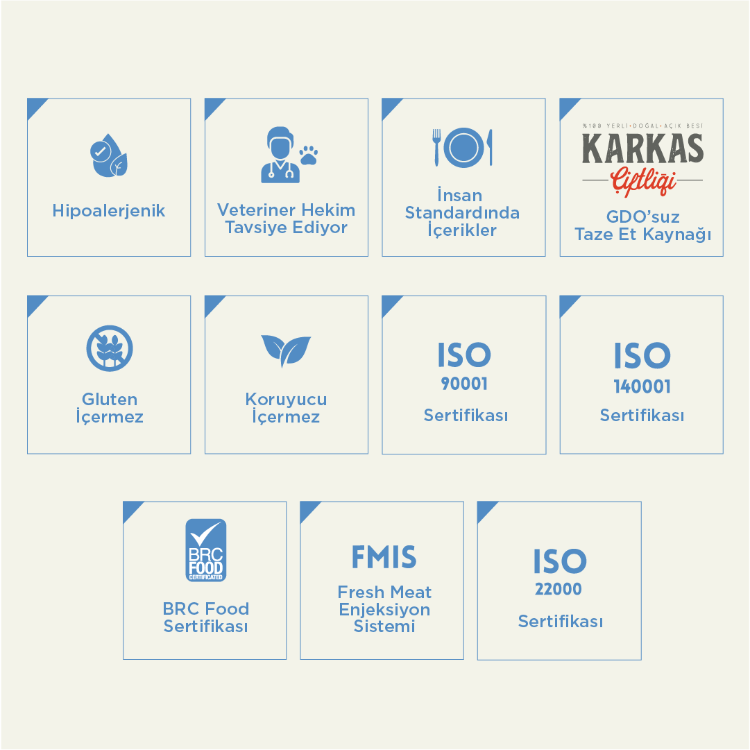 Nem %8, Ham Protein %33, Ham Yağ %12, Ham Selüloz %3, Ham Kül %8, Omega 3 0.65 mg/kg, Omega 6 3.60 mg/kg, Vitamin A (E672) 25.000 IU/kg, Vitamin D (E671) 1.500 IU/kg, Vitamin C (E301) 25mg/kg, Vitamin E (EA700) 150 mg/kg, Taurin 1800 mg/kg