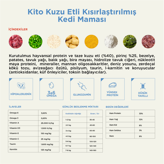 Kito Doğal Besi Kuzu Etli Kısır Kedi Maması 8 Kg