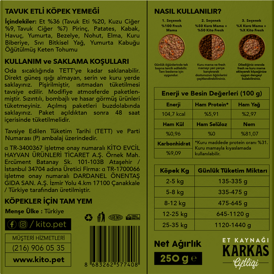 Kito Fresh; yüksek protein, dengeli vitamin mineral içeriği ve doğal lezzetiyle kedinizin ve köpeğinizin ihtiyacına uygun şekilde hazırlanmıştır. Düşük kaliteli yan ürünlere yer vermeden, patili dostlarınızın sağlığını en az sizin kadar önemsiyoruz.
