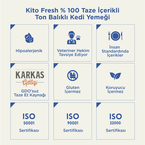Taze et içeren Kito Kuru Mamalar ile %100 taze içeriklerden üretilen Kito Fresh mamaların birlikte kullanımı, patili dostunuzun öğünlerini hem besin değeri açısından güçlendirir hem de günlük beslenme rutinine doğal bir çeşitlilik katar.