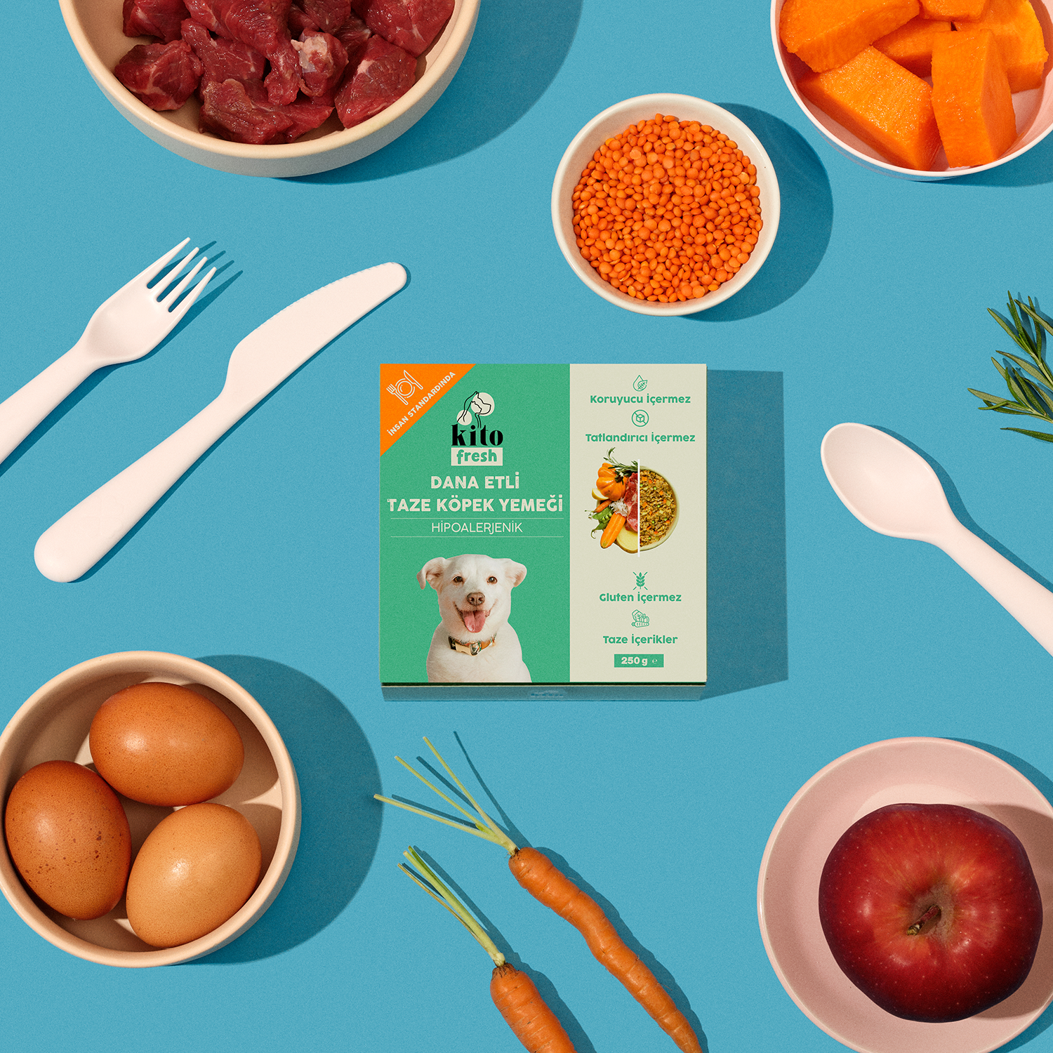 Koruyucu ve Katkı Maddesi İçermez: Alerjisi veya çeşitli rahatsızlıkları olan köpekler için hangi içeriklerin beslenme programından çıkarılacağını, hangilerinin programa dahil edileceğini dikkate alarak Kito Fresh’i ürettik.