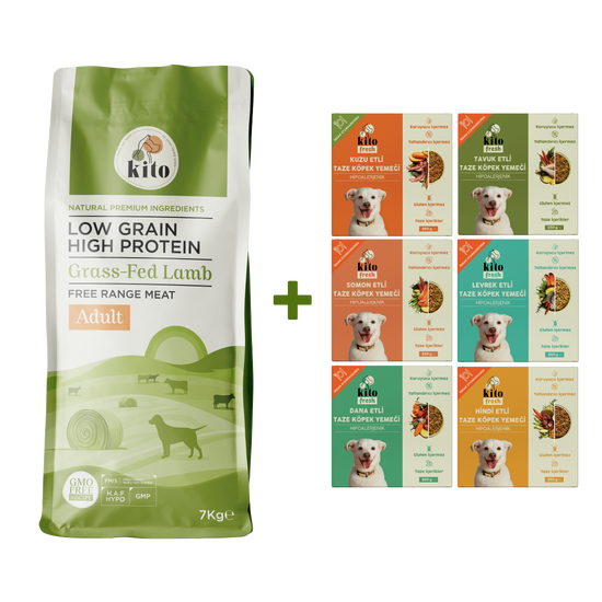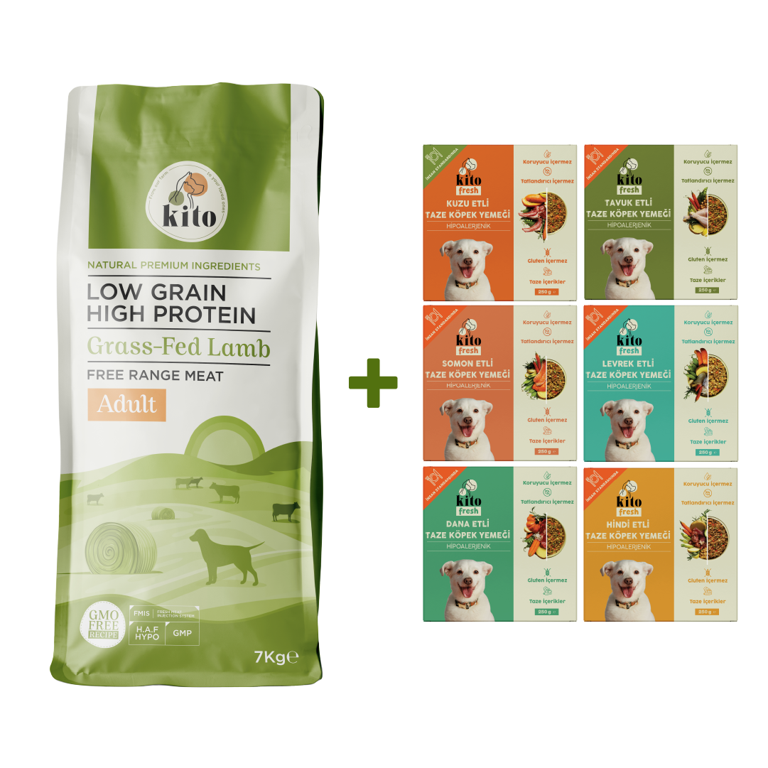 Kuzu Etli Yetişkin Köpek Maması 7 Kg + Kito Fresh %100 Taze İçerikli Mama Tanışma Paketi