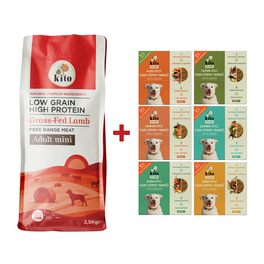Kuzu Etli Yetişkin Mini Irk Köpek Maması 2.5 KG + Kito Fresh %100 Taze İçerikli Mama Tanışma Paketi