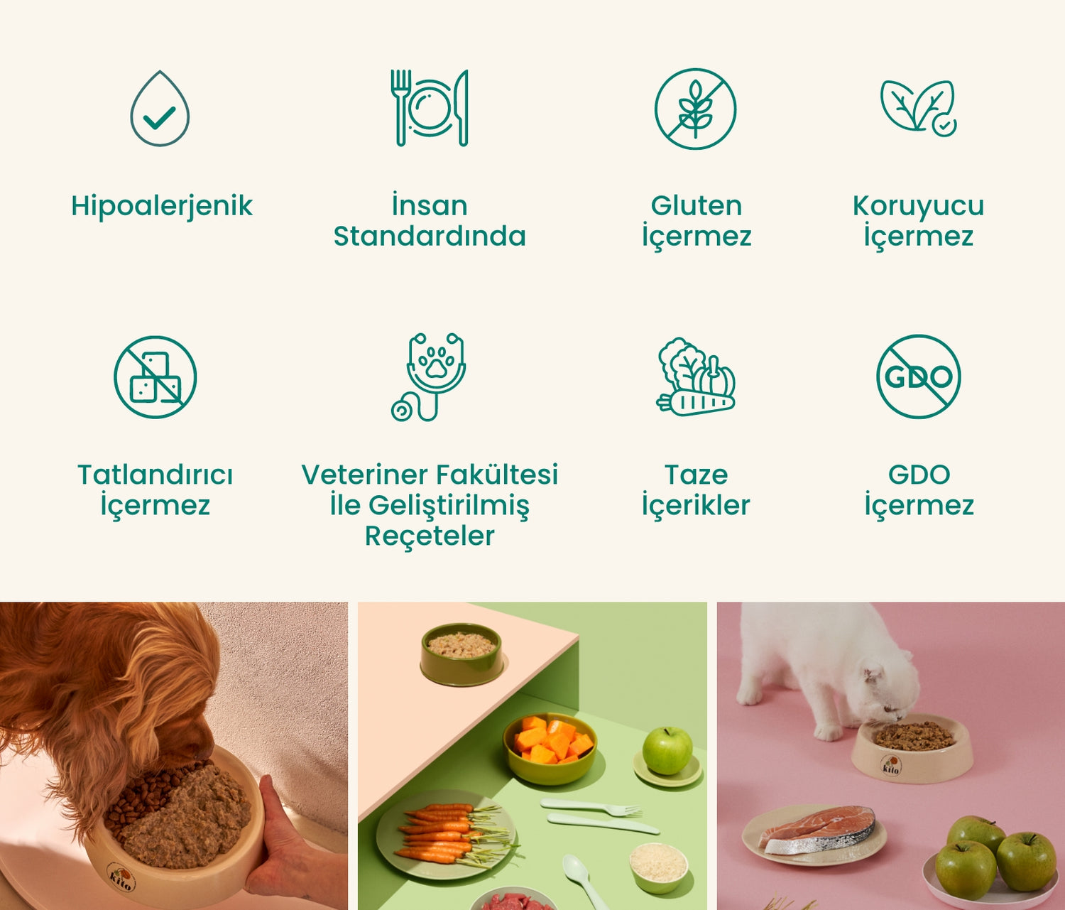 Kito olarak patili dostlarımız için güvenilir ve sağlıklı bir beslenme ekosistemi geliştirmekten mutluluk duyuyoruz. İnsan standardında taze içeriklerle hazırladığımız Kito Fresh mamalar, İstanbul Üniversitesi’yle birlikte oluşturduğumuz özel reçetelere göre üretiliyor ve evcil dostunuzun tüm besin ihtiyaçlarını karşılayacak şekilde formüle ediliyor. Hiçbir katkı maddesi içermeyen bu yemekler, yüksek sindirilebilirlik ve gerçek içerik arayanlar için birebir.