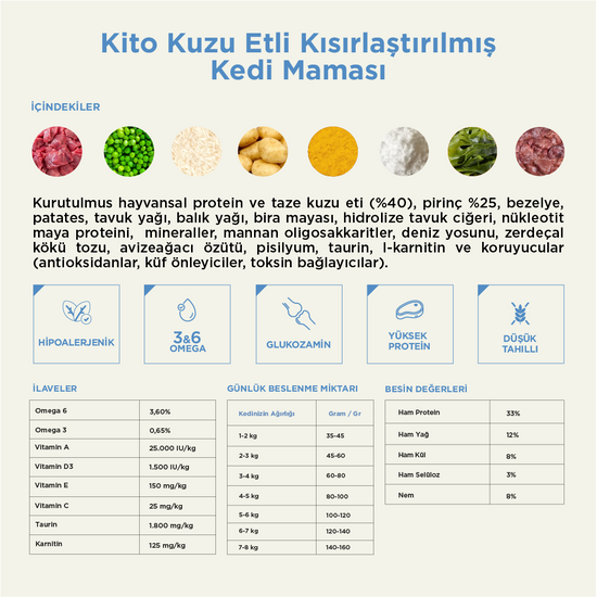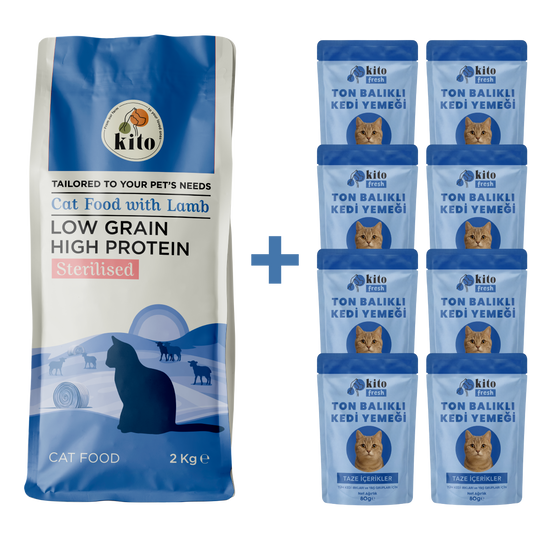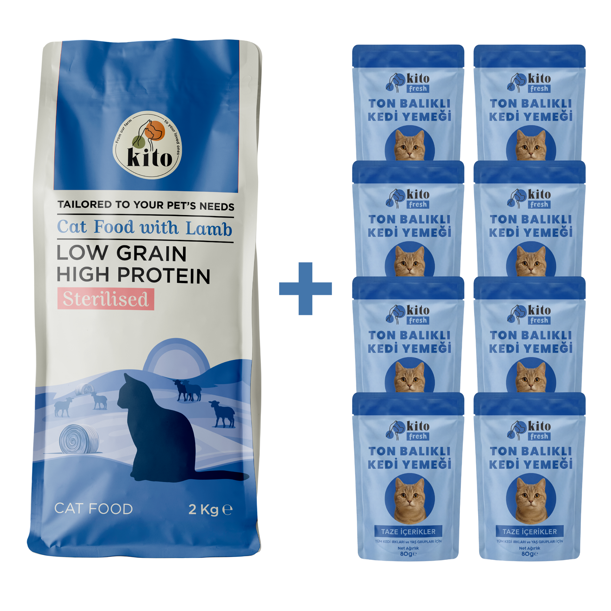 Kuzu Etli Kısır Kedi Maması 2 Kg + 8 Adet Kito Fresh Ton Balıklı %100 Taze İçerikli Mama