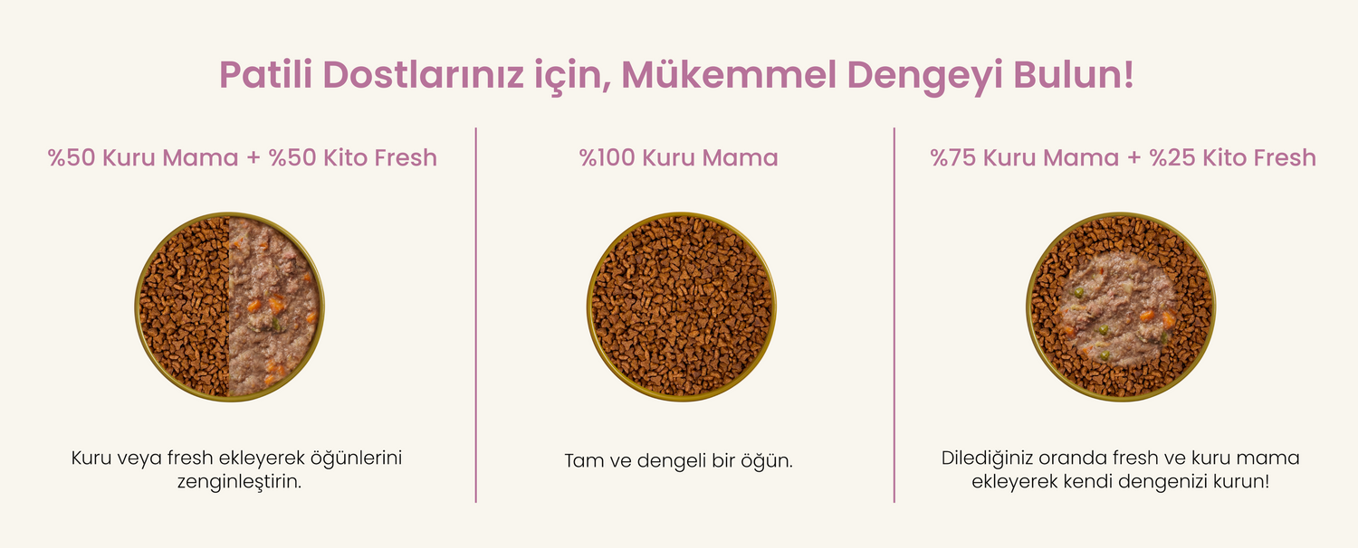 Kito Fresh mamaları hassas cilt yapısına ve sindirim sistemine sahip patili dostlar için, alerji ve hassasiyetleri göz önünde bulundurarak, sağlıklı beslenme programlarına uygun şekilde hazırlıyoruz.
