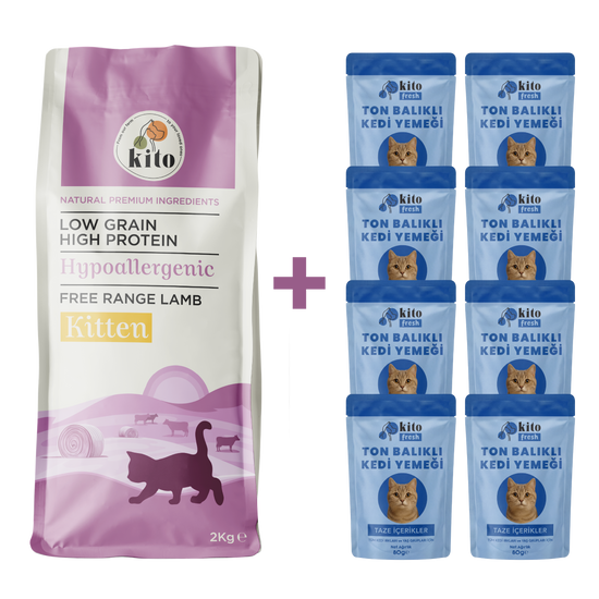 Kuzu Etli Yavru Kedi Maması 2 Kg + 8 Adet Kito Fresh Ton Balıklı %100 Taze İçerikli Mama
