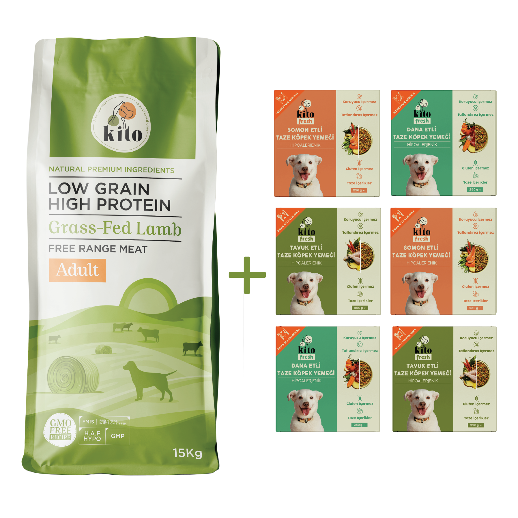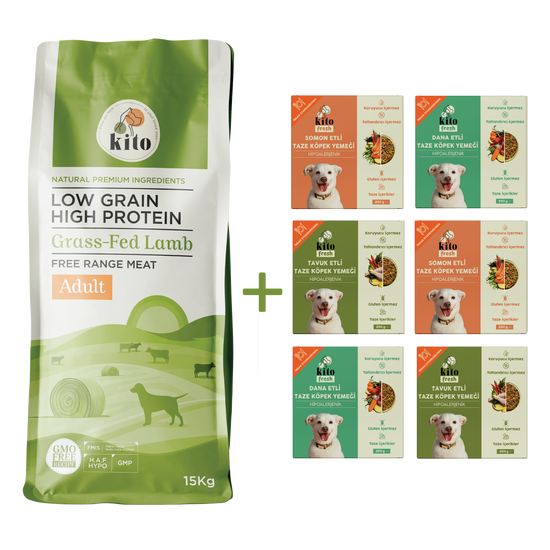 Kuzu Etli Yetişkin Köpek Maması 15 Kg + Kito Fresh %100 Taze İçerikli Mama Tanışma Paketi