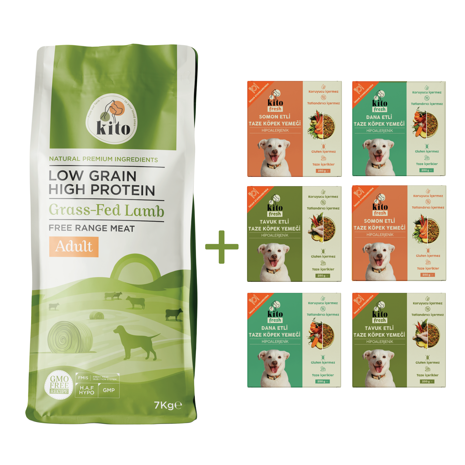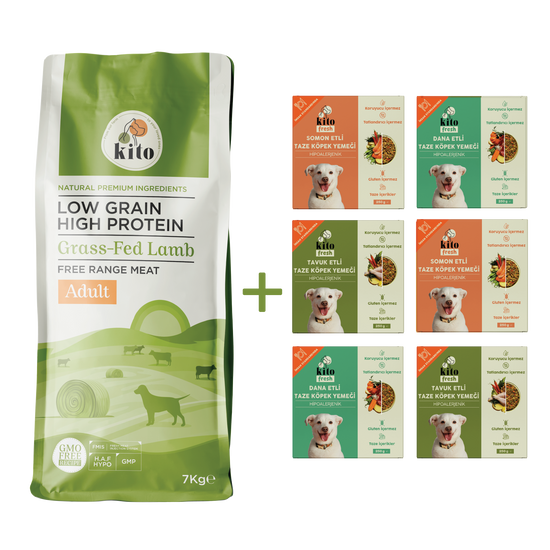 Kuzu Etli Yetişkin Köpek Maması 7 Kg + Kito Fresh %100 Taze İçerikli Mama Tanışma Paketi