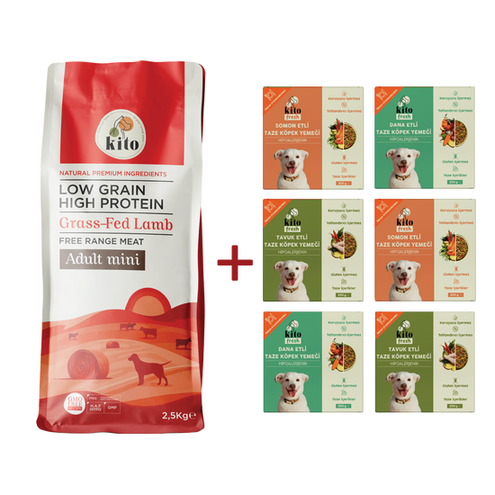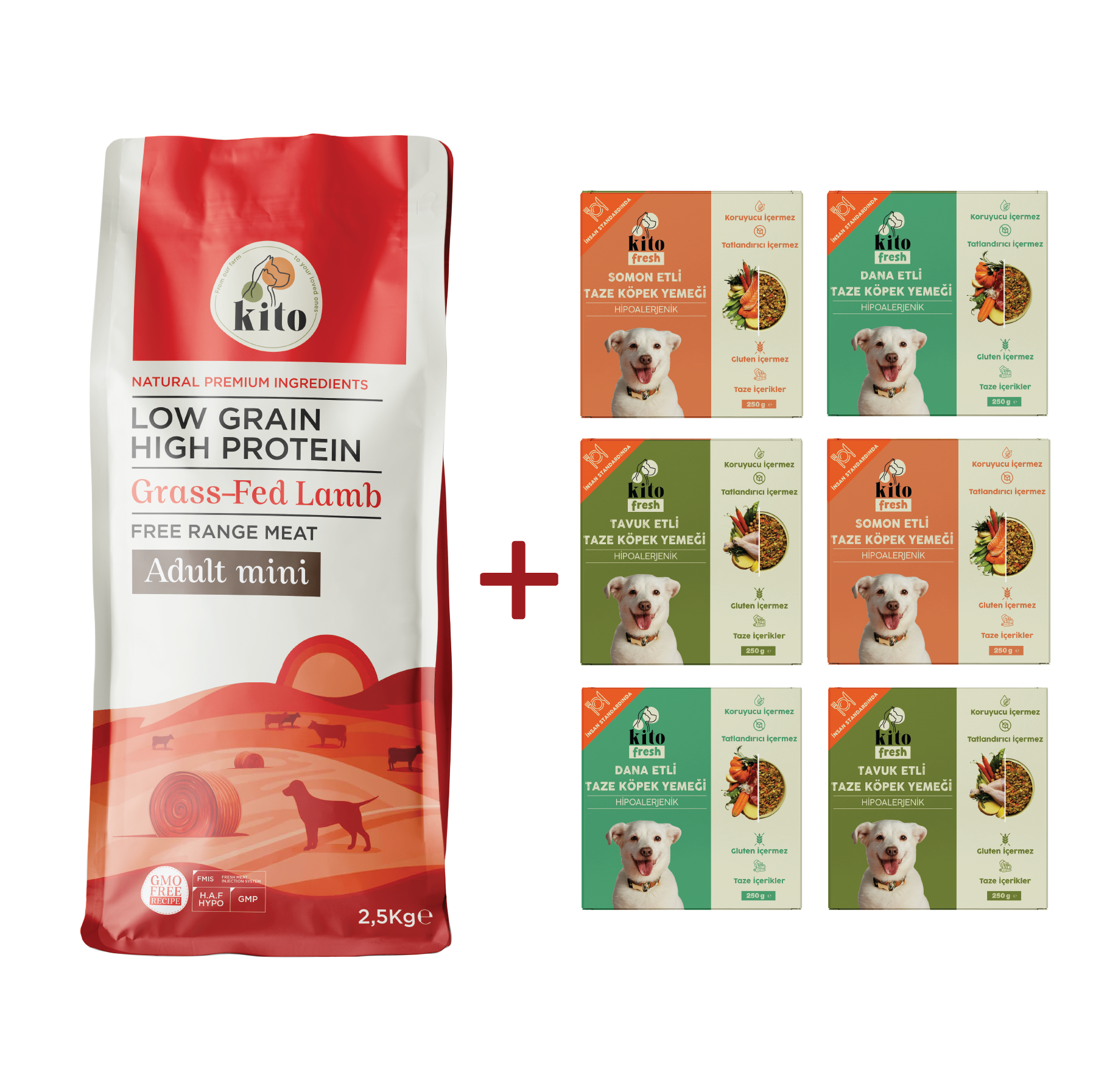Kuzu Etli Yetişkin Mini Irk Köpek Maması 2.5 KG + Kito Fresh %100 Taze İçerikli Mama Tanışma Paketi